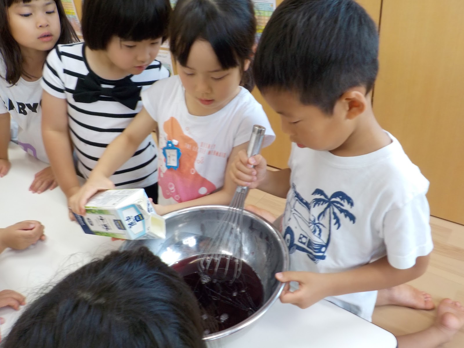 牛乳を入れたら大きな泡だて器で混ぜました。